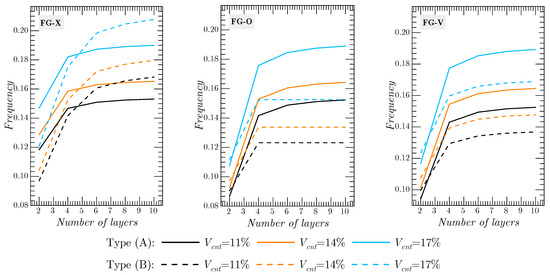 To understand the impact of the number of layers and to view the advantages of the proposed structure, Figure 5 is presented. Clearly, as shown in these figures, increase in the number of layers produces a stiffer structure. Comparing the two structure types, the CNTRC structure Type (B) in distribution FG-X has the highest stiffness, and therefore an increment in the dimensionless frequency. In addition, as is known, increase in the volume fraction increases the rigidity of the structure regardless of the CNTRC type and the CNT distribution. The use of more than two layers in the case of FG–O CNTRC(B) barely changes the frequency values, whatever the volume fraction.