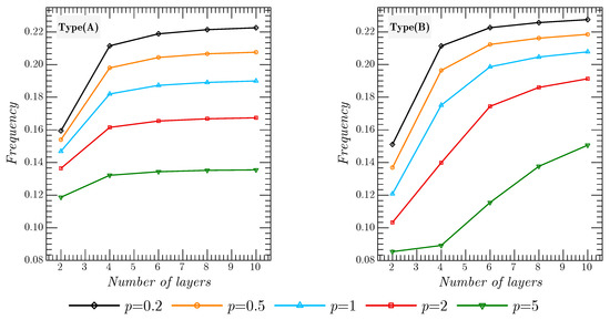 In Figure 6, we plotted the dimensionless frequencies of two types of simply supported CNTRC plates with FG-X distribution as a function of the number of layers and the inhomogeneity material parameter p. Through these curves, we can clearly see that the material parameter p has a significant effect on the CNTRC(B) plates, more so than the CNTRC(A).