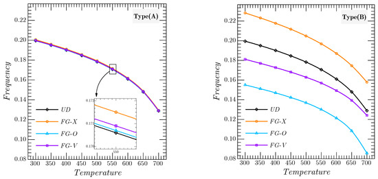 Effect of temperature on the dimensionless frequency of CNTRC shells (SSSS, p = 1, N = 10, , , ).