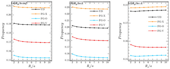 In Figure 8, we show the radii of curvature on the dimensionless frequencies of CNTRC(B) shells by fixing the radii of curvature at inf, 5 and −5. In the case of the cylindrical shell and the elliptical-paraboloid shells (R/b = inf, 5), the augmentation of the radii of curvature leads to a decrement in frequencies for the values , whatever the CNT distribution pattern is, and then the results are almost constant.