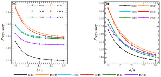 The impact of various boundary conditions and the geometry of the CNTRC(B) plate (b/a and a/h) on the frequencies is plotted in Figure 9. The dimensionless frequencies decrease with decrease in the thickness ratio a/h. For the aspect ratio b/a effect, the frequencies decrease critically for values . In addition, the fully clamped shells have the highest values of frequency, while the lowest values are for the simply supported one.