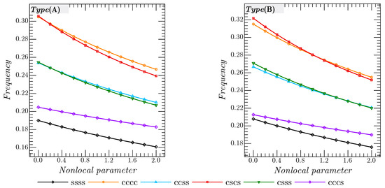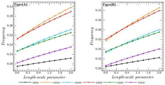 To show the nonlocality effect on the dimensionless frequency of the two types of CNTRC spherical shell for various boundary conditions, Figure 10 curves are plotted. The nonlocal parameter μ is changed from 0 to 2. Regardless of either the CNTRC type or the boundary conditions, it is seen from this figure that the inclusion of the nonlocal parameter reduces the plate stiffness, and therefore decreases the dimensionless frequencies. Unlike the nonlocal parameter effect, in Figure 11, it is observed that the dimensionless frequency decreases with increase in the length-scale parameter.