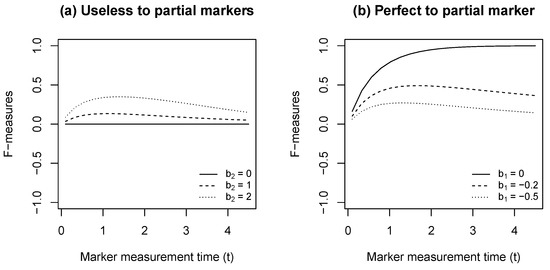 In Figure 1, we explore the numerical behavior of the time-varying F-measure under the motivation scenario described above. In particular, we assume Model (2) with a constant baseline hazard where Without loss of generality, we assume and . With the model assumption, the F-measure has a closed-form formula with details in the Appendix D. Figure 1a has varying visualized F-measures curves from an useless marker with to partial markers with Figure 1b has varying gives the F-measure curves from a perfect marker with to partial markers with