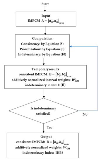 It is obvious that If , then for all . That is, all values become crisp, and is thus reduced to an MPCM; otherwise, contains indeterminacy, and the larger the , the higher the indeterminacy of this [55]. Moreover, within a hierarchical structure, the global priority weights that aggregate the local priority weights will become meaningless if the local priority weights are not normalized [53]. In order to bridge these three gaps (consistency, indeterminacy, and normality) mentioned above, we have proposed a model of acceptable IMPCM [52].