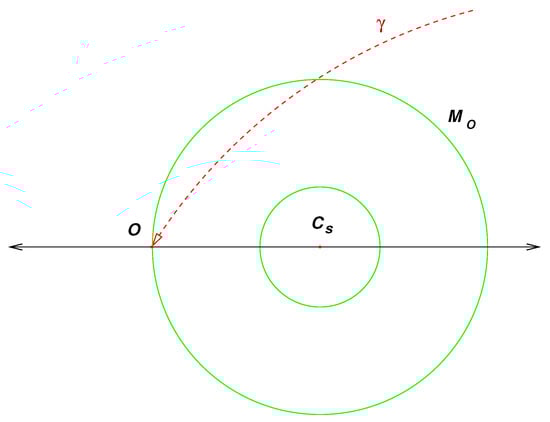 - Comoving coordinates. These coordinates assign constant spatial coordinate values to observers who measure the universe as isotropic. As such observers move along with the Hubble flow, they are called comoving observers. CMB is also perceived to be isotropic. It is useful, for our purposes, to assign comoving coordinates to every point of the universe because LFRW and LTB universes are in expansion. Moreover, due to the spherical symmetry of such universes we choose coordinates , with the origin in the symmetry centre of the perfect fluid which is their source. Furthermore, we take the coordinates (beeing O the observer), as the coordinate becomes useless in our study. Additionally, for symmetry reasons, it is sufficient to study the spatial half-plane that contains the axis (see Figure 1).The M coordinate is a label associated to every spatial spherical surface with centre in , named shell, and is related to the mass-energy contained in the surface defined by the shell. The radial coordinate of such a shell depends on the time and is related with M and through the EE.In FLRW, we choose an arbitrary point as the origin of coordinates and an arbitrary direction as the axis (at constant t, all the axes are equivalent) and the coordinates are also defined, where r is a radial coordinate, which is also comoving. The shells in this universe are a mere auxiliar definition which depends on the origin of coordinates.