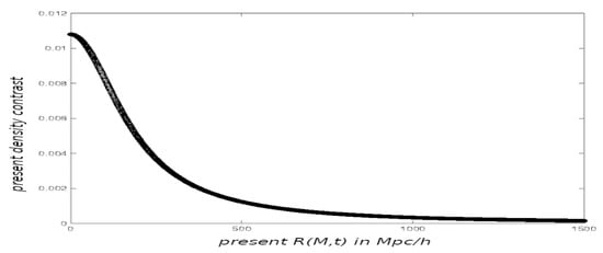 - Computation of R(M,t): From Equation (1) and the density profile, one hasThis equation has a unique positive solution of for each . Once M is known, it can be written in the following way:and it can be applied to any method of roots computation as the solution is unique and simple. As in the FLRW, one has , and can be taken as an initial value for the Newton method. It still has to be determined whether the error tolerance is admissible for R. Therefore, a method to obtain the radial coordinate associated to each shell is achieved with a prefixed relative error bound. That is, the profile is obtained.