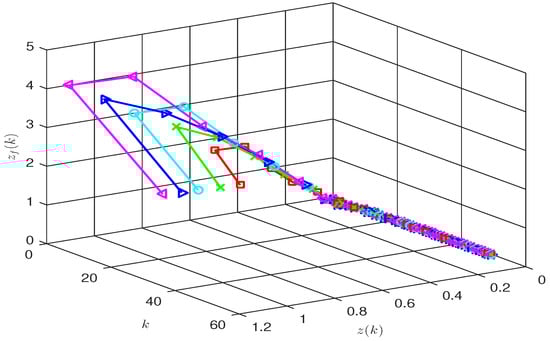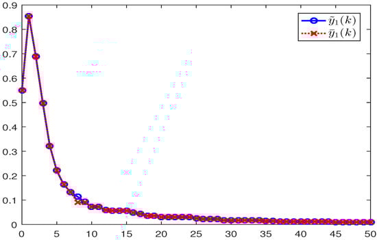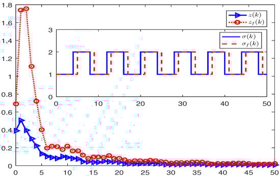 Choose the same parameters as in Example 1. Furthermore, under dynamic event-triggering condition (41) and (42), we give . By Theorem 2, the filter gain matrices can be obtained: