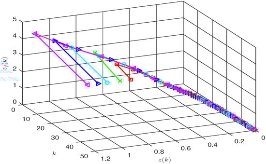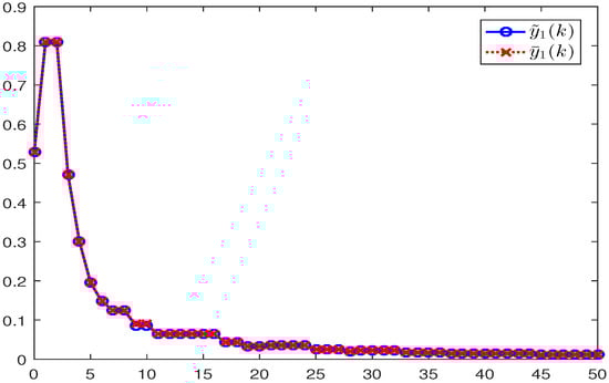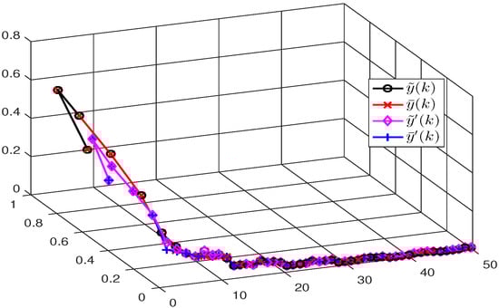 Due to and , this yields , and . Thus, we have , and . Similarly, we can obtain , and . By (37), (38), and Lemma 1, we have and . Using recursive derivation gives and , that is to say, the error systems (9) and (10) are positive.