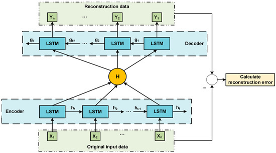 In Figure 1, represents the original input data, and represents the hidden state passed in the encoder and decoder, respectively, H is the encoding vector output by the encoder, which means the essence of the original input data, and represents the reconstructed data through the decoder. The model’s error is the difference between the reference input and the reconstructed data, defined as the reconstruction error. The auto-encoder uses the mean square error (MSE) as the loss function to calculate the reconstruction error. The loss function is defined as follows: