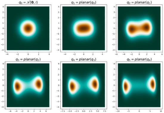Figure 3 shows the changes in the data distribution for the Planar flow. From Figure 3 we can see that by the action of the Planar flow, the single-peaked Gaussian distribution is transformed into the complex multi-peaked distribution.
