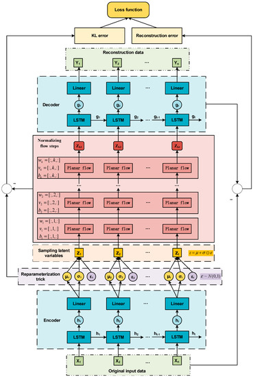 The Planar flow is used as the posterior to fit the complicated posterior distribution. It enables the VAE prediction model to learn and process time series data with complex characteristics and improves the network’s degree of nonlinearity and dynamic adaptability. The loss function of PFVAE is shown in Formula (11):
