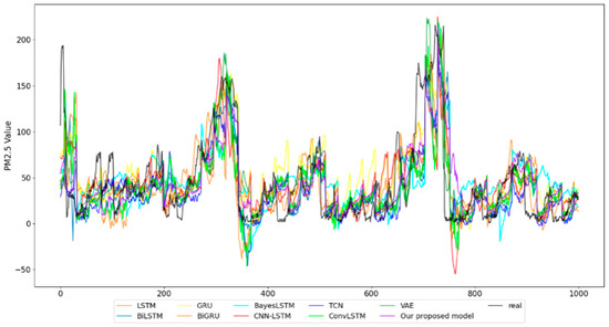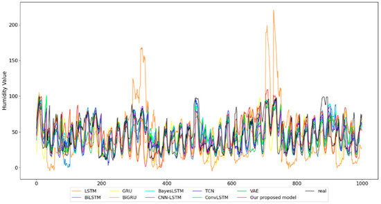 In this study, we used the humidity data of Haidian District, Beijing, China to carry out verification experiments. The sampling time was from 1 January 2017 to 31 December 2019, with a sampling frequency of 1 h. In Figure 9, we show part of the prediction results of each model.