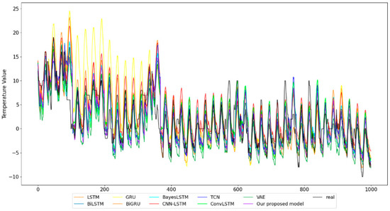 In the experiment, we compared the prediction performance with the other seven models, LSTM [34], GRU [35], BiLSTM [36], BiGRU [37], TCN [48], CNN-LSTM [38], ConvLSTM [39], BayesLSTM [40], and VAE [53], under the same parameters and the same dataset.