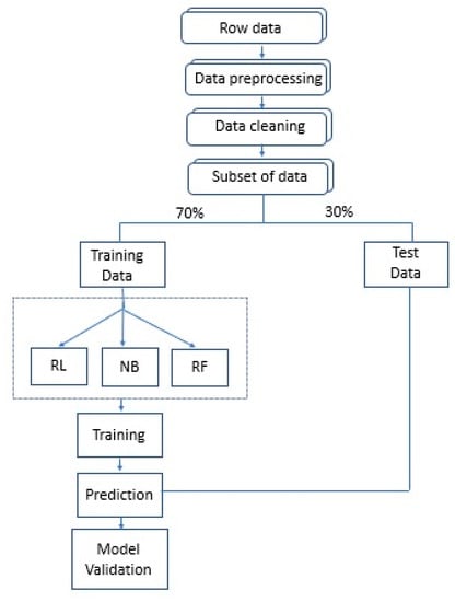 In this study, three classifiers were used: LR, NB, and RF. The data were divided into a training set and a test set (70% and 30%, respectively). The training set was used to build the classifier; however, to calculate the precision measurements of the models in order to validate them, the data from the test set were applied. The parameters used to evaluate the efficacy of the individual classifiers and compare them included sensitivity, specificity, precision, and error.