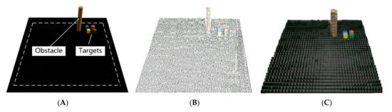 The Kinect, mounted on the tripod, was placed on the left side of the workspace, 0.6 m high from the table. Point clouds collected by Kinect outside the workspace were deleted using a passthrough filter to reduce the interference. A voxel grid filter was then applied for downsampling in order to cut down the amount of calculation while not destroying the geometric structure of the point clouds. To remove some outliers, the RadiusOutlierRemoval filter was then utilized in this study. After the preprocessing, the filtered point clouds (Figure 4B) were converted into Octomap (Figure 4C) [43] in ROS and added to its workspace. Therefore, the obstacle could be avoided by the robotic arm during motion planning on ROS. For Octomap, the probability that for each leaf node m could be calculated based on measurements z1:t: