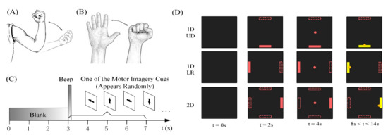 Motor imagery actions and time sequence. (A) MI action 1, flexion and extension of the forearm. (B) MI action 2, opening and closing of the hand. (C) The time sequence of MI without feedback experiment. One of four arrow cues appeared randomly in a trial. (D) The time sequence of virtual control training experiment.