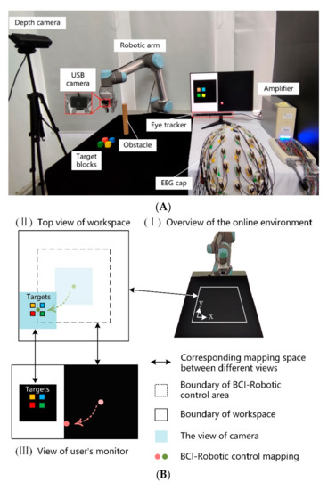 Millions of people in the world suffer from neurological disorders, such as muscular dystrophy, amyotrophic lateral sclerosis (ALS), and cerebral palsy, and lose the ability to control their limbs. These diseases disrupt the communication between the brain and body, which adversely affects a person’s general quality of life. Nevertheless, most of these persons’ brains still retain the function to produce motor-related neural activities like nondisabled [1]. Brain–computer interface (BCI) technology provides alternatives for individuals to interact with the surrounding environment and can offer daily assistance for neurological disorders patients [2,3,4]. At present, there is a growing variety of external devices that humans can control with BCI technology, especially in controlling virtual cursors [5,6,7], quadcopters [8], wheelchairs [9,10], and exoskeleton robots [11,12]. Furthermore, some researchers use BCI to help people with neurological disorders control robotic arms to grasp objects [13,14,15,16]. However, due to the high number of degrees of freedom (DOFs) of the robotic arm, grasping multiple objects in 3D space in a continuous and effective way using BCI is still a hard problem.