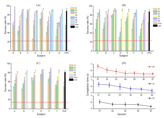The average success rates of each subject in 1D UD, 1D LR, and 2D virtual ball movement control are displayed in Figure 7A–C. In the first session of 1D UD virtual ball control training, the average success rate for all the subjects was 41.7% ± 14.8% and rose to 89.1% ± 5.4% at the last training session. The average success rate increased by nearly 115% for 1D UD training. The average success rate increased from 45.9% ± 17.3% in the first session to 88.2% ± 5.3% in the last session and had a more than 90% increase in the 1D LR virtual ball control training. The 1D control training was shown to be helpful to subjects’ performance in 2D control training. The average success rate at the first session for 2D virtual ball movement control (49.9% ± 9.2%) was higher than that at 1D virtual ball movement control. In the last session of 2D virtual ball control training, the average success rate improved by over 60% compared to the first session.