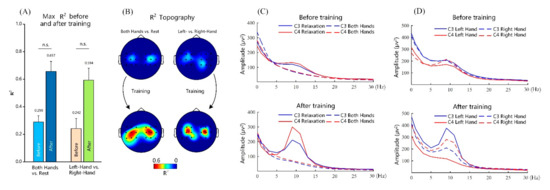 The R2 values and voltage spectra changes before and after the virtual ball control training. (A) Maximum sensorimotor R2 values for virtual ball control training. (B) R2 topographies for virtual ball control training. (C) Voltage spectra for MI of both-hand movement vs. relaxation before and after the virtual ball control training. (D) Voltage spectra for MI of left-hand movement vs. right-hand movement before and after the virtual ball control training.
