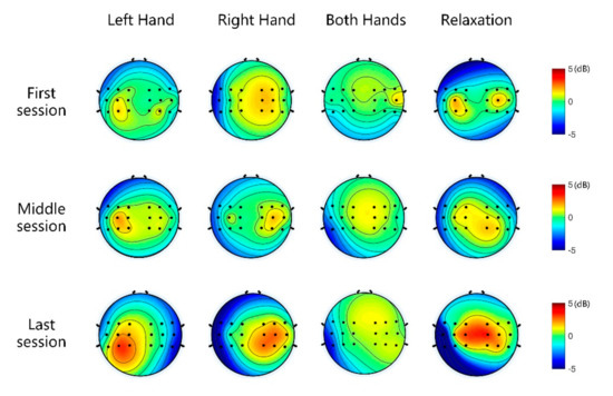 ERS and ERD have been considered to be the product of specific cognitive processes, which are associated with the motor nervous system [46]. The modulation of the mu rhythm is quantified by the R2 values and the topographic map (Figure 8A and Figure 9). As the training continued, we found that users’ ability to control the virtual ball gradually improved. Moreover, the ERD/ERS was more obvious over time, indicating that the MI training with feedback could regulate the movement rhythm of subjects. This further validated that MI training could promote cognitive processes and might be essential for BCI control [47].
