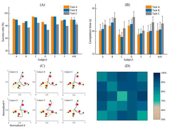 Performance of online experiments. (A) The average success rate of the three tasks in online experiment. (B) The average completion time of successful trials. (C) Trajectory samples of the six subjects for task B. The red circle indicates the position of the obstacle, and four colors (blue, black, yellow, green) are used to distinguish the trajectories of different targets in the EEG-control stage. The red line indicates that the robotic arm grasped the target automatically. (D) The success rate distribution within the workspace.
