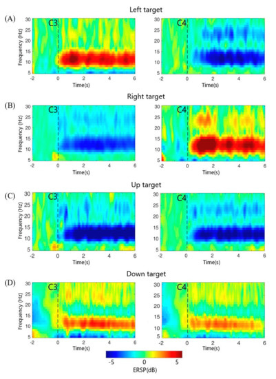 Dynamic time–frequency spectral changes at C3/C4 during MI in the online experiment for subject C. Time–frequency spectral maps of four different targets in Figure 10C: (A) left target, (B) right target, (C) up target, and (D) down target. Blue color indicates ERD and red color stands for ERS. The virtual ball appeared on the screen at 0 s; virtual ball and robotic arm started to move at 1 s. The baseline spectra were estimated from the EEG signal selected from −2 to 0 s during which the subject remained in a holding state.