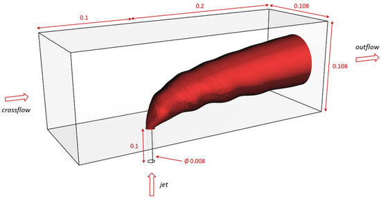 Considered experimental results and relevant setup have been previously described in [14,15]. Results have been obtained using the particle image velocimetry (PIV)/laser-induced fluorescence (LIF) methodology. The test setup consisted of a rectangular channel with a square cross section and a pipe. The pipe was mounted flush with the wall thus creating a round jet entrance. Diameter of the jet inlet equals . Crossflow entrance side equals . At the crossflow inlet, velocity is hence the Reynolds number is . Velocity at the jet inlet is with . The velocity ratio equals , where and U are respective densities and velocities. Additional information on the experimental setup and specifics can be found in the original paper [14].