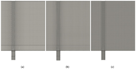 Grids used in grid convergence study. Images are fragments of the computational domain near the jet centerline: (a) coarse grid; (b) medium grid; (c) fine grid.