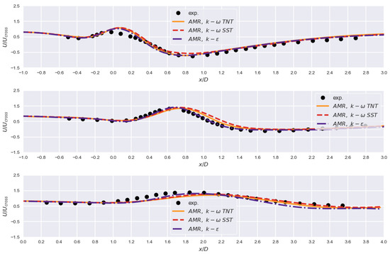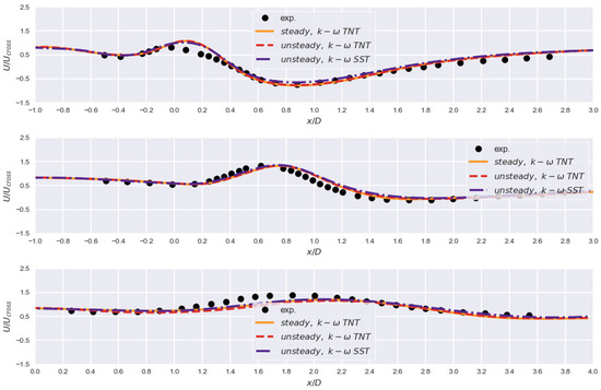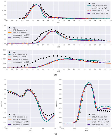 Overall, presented results match the experimental curve slightly better than the RANS results from [15]. This is true for steady and transient results. At , downstream of the point , scalar predictions are consistent but slightly worse. Still, for , experimental trendline is better matched. Mean velocity profiles, and , show a better trend as well. Mean values of passive scalar and velocity for steady and transient cases are virtually indistinguishable. This can be partially attributed to averaging conducted in order to report the results. Further validation is conducted for the velocity component . Similarly to scalar concentration, values are assessed at different sections. Results are given in Figure 4.
