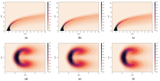 Two–dimensional plots of the scalar c at (top) and (bottom). (a,d) steady simulation using the TNT model; (b,e) transient simulation using the TNT model; (c,f) transient simulation using the SST model.