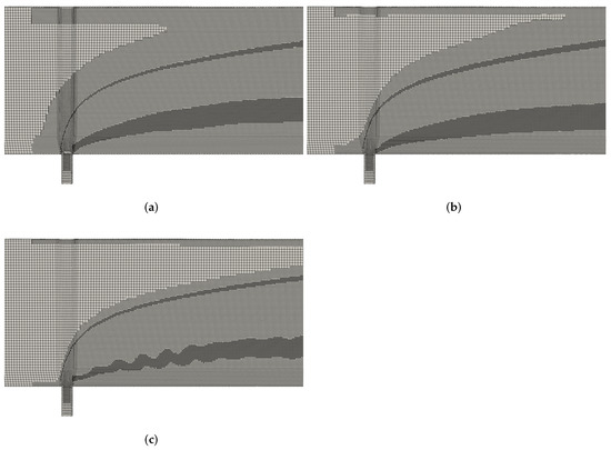 Grids generated using the AMR approach. Variances in mesh refinement are a direct consequence of innate differences between turbulence models. Images are fragments of the computational domain: (a) model; (b) TNT model; (c) SST model.
