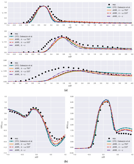 Several aspects of the current setup have been additionally assessed. Value of the turbulent Schmidt number, , is commonly suggested for RANS simulations [15,18,33]. Often, however, for specific turbulence models and depending on the problem, this value is modified. This aspect has therefore been considered and results for a range are presented in Appendix A, Figure A1. It is evident that satisfactory results are obtained for . Higher values are able to conform to peaks, but are lacking for the majority of the relevant region. Lower values on the other hand produce more sensible results but are inadequate when assessing concentration peaks. Utilized is hence an appropriate choice and has been thus kept throughout.