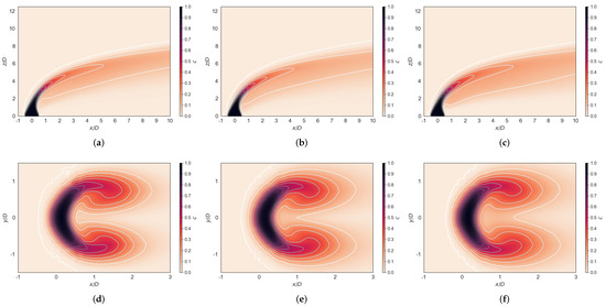 Two-dimensional plots of scalar concentration presented in Figure 9 show good agreement with the results for the fine grid (Figure 5). Results for demonstrate a strong and amplified downstream trend. This is particularly true for variants. The SST model consistently assumes, based on values of c, broadest mixing region. For , distribution zones of c are slightly enlarged when compared to Figure 5. The overall accuracy is satisfactory. Inability to fully reconstruct the experiment is typical for RANS models; they tend to provide acceptable mean values but are unable to fully resolve flow specifics.