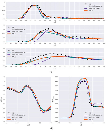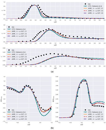 Results obtained using the WALE model and AMR: (a) concentration of passive scalar c at , , (top to bottom) where ; (b) profiles of mean velocity components for and .