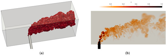 Results obtained using the WALE model with AMR: (a) isosurface of the passive scalar ; (b) distribution of scalar c at .