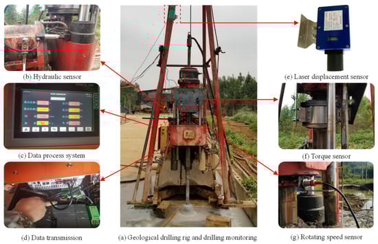In order to analyze the relationships between DPM parameters and rock drillability, a new drilling-monitoring system was utilized to perform drilling test. The system, as shown in Figure 1, can record the thrust (F), torque (T), rotating speed (N) and rate of penetration (ROP) in real time at 1-s interval through the corresponding sensor. These sensors mainly include pressure sensor, rotating speed sensor, torque sensor and laser displacement sensor. Finally, the recorded data will be transformed to the data processing system, where the data can be stored and processed. Meanwhile, the system can adjust the thrust and rotating speed artificially during the process of drilling. Moreover, all sensors are easily to be mounted and have high measurement precision, so it is convenient and reliable to conduct drilling test in field.