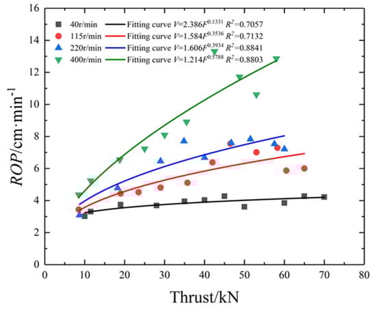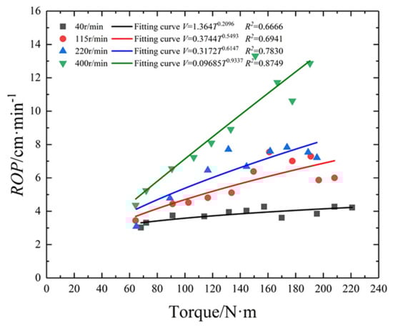 The relationships between thrust, torque, ROP and SE were analyzed under different rotating speeds. There is a good positive linear relationship between thrust and torque, as shown in Figure 2, and the fitting functions are presented in Table 2. The relationship between thrust and ROP is powerful, and their regression curves and fitting functions are shown in Figure 3 and Table 2, respectively. Meanwhile, the relationship between torque and rotating speed was obtained, as shown in Figure 4 and Table 2, respectively.