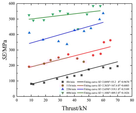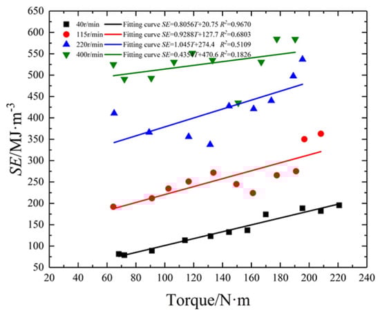Similarly, the values reflecting the relationship between SE and thrust (or torque) under different rotating speeds were obtained, as shown in Figure 5 and Figure 6 and Table 2. There is a good linear relationship when the rotating speed is 40 r/min. However, there is no significant statistical relationship under other rotating speed conditions. This means that the single variable is unable to reflect the SE of drilling effectively.
