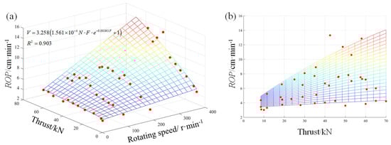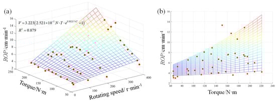 The rotating speed, thrust and torque were selected to establish regression models of ROP. We defined them as N-F-ROP and N-T-ROP models. The three parameters correspond to the X-axis, Y-axis and Z-axis variables, respectively. Through regression analyses, the N-F-ROP and N-T-ROP models were obtained, and their corresponding three-dimensional fitting curves and formulas are shown in Figure 7 and Figure 8, and Equations (2) and (3), respectively.