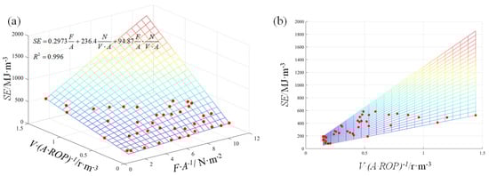 Moreover, because there is a good linear relationship between thrust and torque, we improved the SE model proposed by Teale. The thrust, rotating speed, ROP and drilling area (A) were taken as independent variables to establish the regression model of SE. The results show that the above parameters have a significant statistical relationship, as presented in Figure 9 and Equation (4).