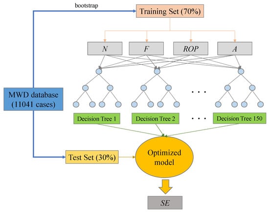 A total of 11041 sets of real-time DPM data were used for training and testing in the RF model. Because there is a good linear relationship between torque and thrust, and the drilling area (A) is a constant, the rotating speed, thrust and ROP were taken as the input variables, and the output variable was SE. It should be noted that the average speed was used for the training and testing process in the RF model instead of the real-time speed under different thrust conditions due to the real-time speed possibly being a negative value caused by the slight rebound of the drill pipe during drilling. Of the DPM data, 70% were were selected randomly to be the training set, and the remaining 30% of the data were taken as the test set. The ntree and mtry were set to 150 and 2, respectively. The optimized prediction model was obtained by training, and the ultimate result was obtained through prediction. The architecture of RF is shown in Figure 10.