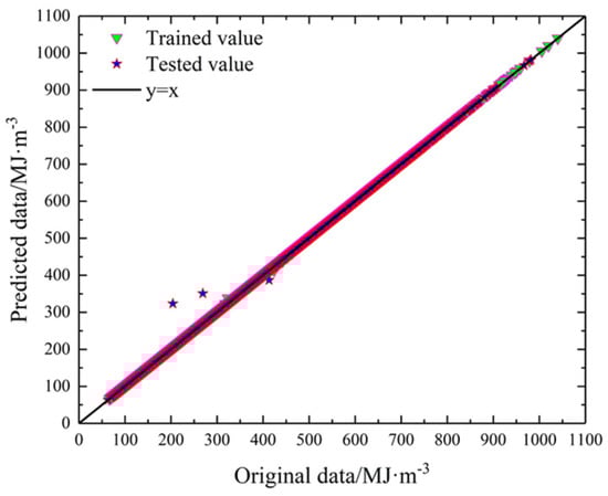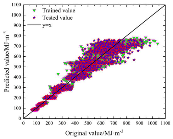 In order to evaluate the prediction accuracy of the established RF model, the R2 and RMSE were calculated, as shown in Table 4. Meanwhile, the comparison of the original value and predicted value is shown in Figure 11. From the predicted results, we can find the R2 and RMSE of the training set and test set are 0.9455 and 0.9591, 42.1341 and 48.7496, respectively, which indicates that the established RF model has a good prediction performance.