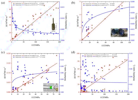 According to the calculated SE and Id, the relationship between them and uniaxial compressive strength of rock under different cutting tools is established, respectively. When the standard diamond solid bit was used, the relationship between SE (or Id) and UCS is present in Figure 14a, and the corresponding regression model is shown in Table 6. Similarly, the relationship between SE (or Id) and UCS is present in Figure 14b,c, in which the impregnated diamond bit and PDC bit were performed to drilling. Their regression models are also shown in Table 6. Finally, all the data under the three types of bits were used to establish the relationship between the SE (or Id) and UCS of rock. The regression model and fitting curve are shown in Table 6 and Figure 14d, respectively.