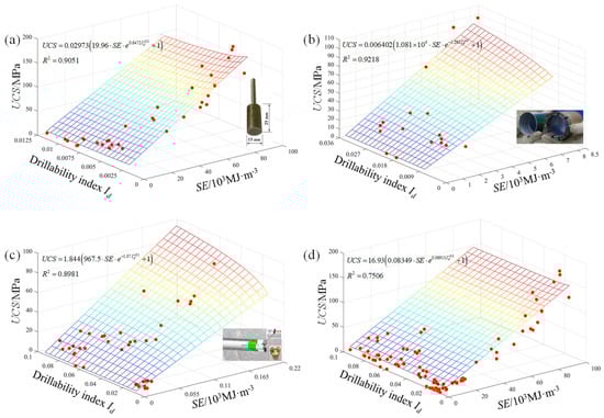 The univariate models of UCS indicate that the performances of the UCS models based on SE (or Id) under different bits are not very good, especially for the model based on Id. Therefore, the UCS prediction model was established by combining the SE and Id. Similar to the univariate modeling, the UCS prediction models under different bits were established, respectively. The UCS prediction models under standard diamond solid bit, impregnated diamond bit and PDC bit are shown in Figure 15a–c, respectively, and the corresponding fitting equations are shown in Equations (9)–(11). Finally, all the data were combined to produce an UCS prediction model, and the regression curve and fitting equation are shown in Figure 15d and Equation (12). The results show that the performances of the established models combining SE and Id are significantly superior to that of the univariate model.