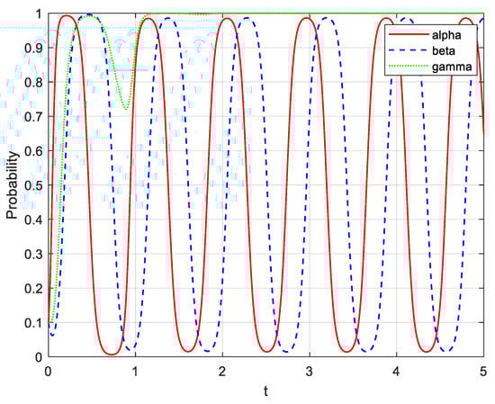 As mentioned above, , , and respectively represent the initial proportion of governmental supervision strategy, the manufacturer’s resilient supply chains strategy, and the integrator’s resilient logistics service supply chain strategy. The fixed initial values are , , and , respectively. As shown in Figure 4, with the mutual influence through the evolution between the government, manufacturers, and integrators, the equilibrium convergence of each subject is not only related to the initial proportion of their selection but also affected by the initial proportion of the manufacturers’ and integrators’ strategy selection. Meanwhile, the probability of the three parties participating in the evolution is similar to a certain periodic fluctuation, and the equilibrium state cannot be achieved all the time. It shows that there is no stable point in the tripartite evolutionary game.