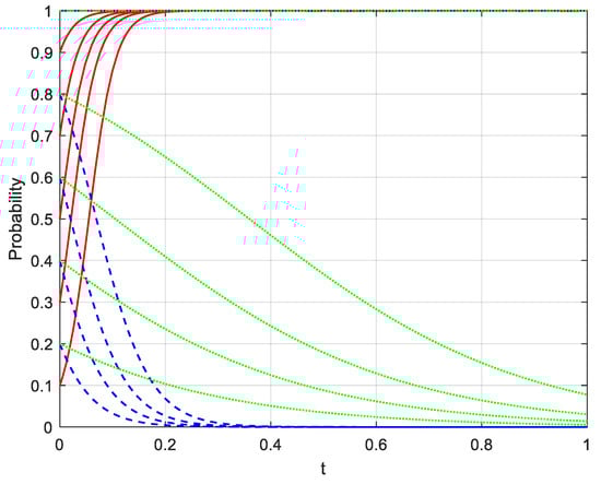 In this paper, numeric experiments are used to analyze the impact of the initial proportion of each subject selection strategy in the logistics service supply chain and the change in government reward and punishment parameters with the evolution. This section is carried out via the software MATLAB 2017a. To verify the feasibility and effectiveness of the model and avoid the bias of specific examples influencing the model’s reliability, the basic parameters are set randomly within the constraints of the parameter relationship in Section 3.2. The details are as follows: , , , , , , , , , , , , , , , , and . According to these parameters, the overall experimental environment for resilient coordination decision-making of logistics service supply chains with government participation is established, and the sensitivity is adopted to further analyze the impact on resilient decision-making if the government changes the subsidy and penalty degree.
