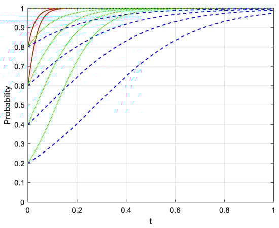 When the initial state is at the intersection of , , and , the strategy of the participants will be in equilibrium (1, 1, 1); when the government only carries out the ‘supervision’ strategy, the manufacturer will adopt the resilient supply chain, and the integrator will implement the resilient logistics service supply chain. The above conclusions are consistent with the current real situation of industrial chain and supply chain logistics in developing countries. As building such resilient supply chains in these countries and regions in the case of emergencies is largely at an initial stage, the government needs to take necessary interventions [33]. In the short term, when the initial state is at the intersection of , , and , the participants converge to (1,0,0). Although the government implements the ‘supervision’ strategy, and the manufacturers and integrators have not seen the operating income of the resilient supply chain and resilient logistics in the short term, even if the government takes the ‘supervision’ strategy in the initial state, the manufacturers and integrators still choose not to adopt or implement the strategy. Therefore, for effective intervention in the short term, the government can take effective reward and punishment measures to encourage the manufacturers and integrators to actively build a resilient supply chain system. In the long run, when the initial state is at the intersection of , , and , the participants converge to the equilibrium state of (1,0,0). Due to the emergencies’ continuous effect on the supply chains, to ensure long-term benefits, even without the participation of the government, manufacturers and integrators will eventually take the initiative to adopt the adoption strategy, which is also the inevitable trend of supply chain development in a risky societal environment.
