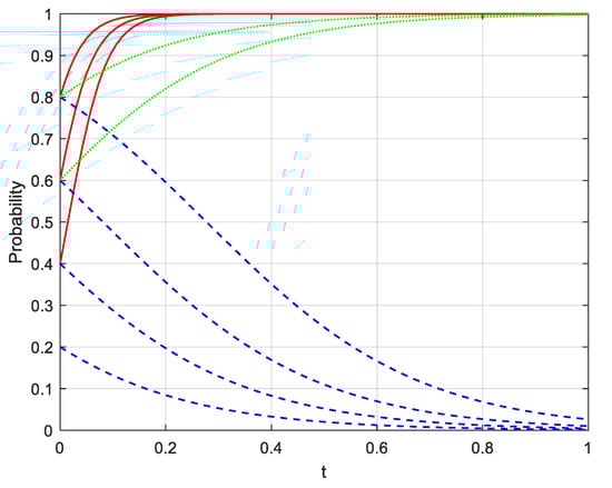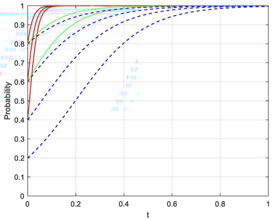 With the initial values that , , and , Figure 2 shows that in different initial states, only considering the change in initial state, the government, manufacturers, and integrators choose the equilibrium strategy without considering the later interaction of the three parties. Consistent with the previous comprehensive conclusion, there are eight different equilibrium results for participants in different initial game states [34]. Figure 5 shows that when the initial government supervision is low, the manufacturers and integrators have relatively little external pressure. Even if the government supervision is significantly increased later, they will still choose not to adopt or implement the strategy. On the contrary, when the government initially adopts high-level supervision, that is, the initial proportion of supervision is adjusted from 0.1 to 0.6, the manufacturers and integrators are under high-level pressure (Figure 6). Manufacturers thus tend to implement the resilient supply chains strategy, while integrators prefer to implement the resilient logistics service supply chains strategy. Even if the government regulation is aborted later, the manufacturers and integrators will intentionally implement resilient supply chains.