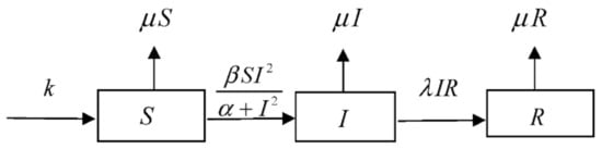 Based on the basic assumptions of the model, the rumor-spreading process with Holling type III functional response is shown in Figure 1: