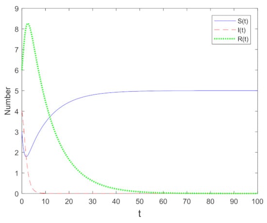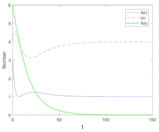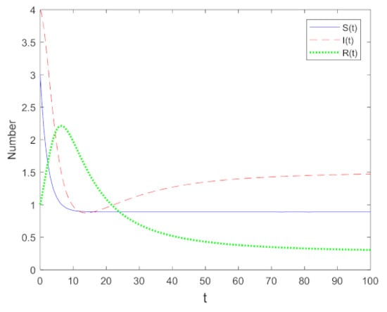 By taking parameters , , , , , we establish in Figure 4 that the model converges to the equilibrium point . No matter what the initial value of the individuals is in the initial state of the model, the number of susceptible people decreases rapidly to reach a stable state. The number of rumor-spreading people drops rapidly and then increases slowly and reaches a balanced state. The number of stiflers increases rapidly, then decreases slowly and reaches a balanced state. Finally, susceptible persons, rumor-spreading people and stiflers will exist.